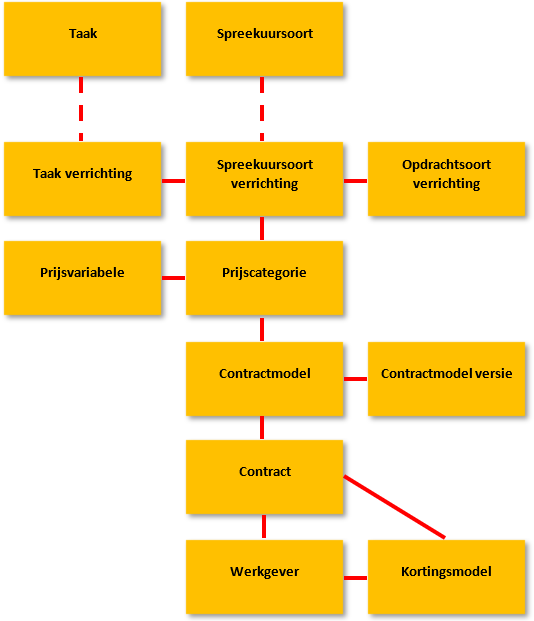 Centraal in de structuur staan de contractmodellen. Wat je boven het Contractmodel ziet zit verwerkt in contractmodellen. Deze contractmodellen bestaan uit verschillende versies die ieder een eigen inrichting kunnen hebben.