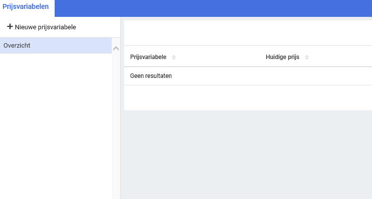 Het Prijsvariabelenbeheer vindt je in het CMM beheer. Wanneer je het Prijsvariabelenbeheer hebt geopend zie je onderstaand scherm. Hierin zie je een optie Overzicht waarmee je aan de rechterkant een overzicht krijgt van alle reeds aangemaakt prijsvariabelen. Verder zie je links boven de knop Nieuwe prijsvariabele. Zoals de naam zegt klik je op deze knop om een nieuwe prijsvariabele aan te maken.
