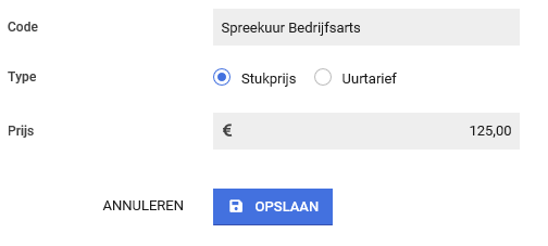 Wanneer je op de knop Nieuwe prijsvariabele hebt geklikt zie je onderstaande velden. De ingevulde code zal je terug zien in een keuzelijst binnen de contractmodellen. Verder geef je aan of het om een stuks- of uur prijs (verrichting prijs wordt dan per minuut berekend) gaat en wat het bedrag moet zijn waarmee gerekend gaat worden.