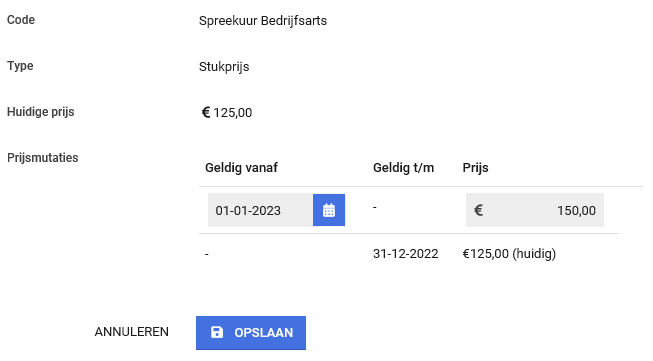 Binnen de mutatie kun je een startdatum hiervoor opgeven. Hierdoor kun je voor de mutatiedatum alle wijzigingen inrichten. De verrichtingen die worden geschreven met een uitvoerdatum na de ingestelde startdatum zullen automatisch gebruik maken van de gewijzigde prijs.