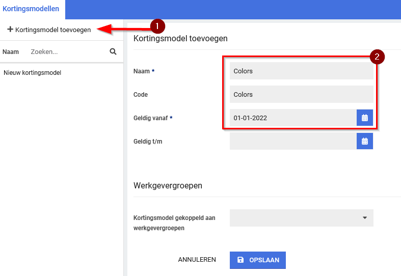 Vul nu in ieder geval de verplichte velden in. Eventueel kan nu of later ene einddatum worden ingevoerd. Daarnaast kan het kortingsmodel worden gekoppeld aan een werkgeversgroep.