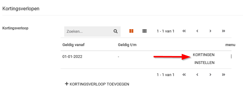 Wanneer je het kortingsmodel opslaat komen er meer gegevens beschikbaar. Nu kun je de kortingen behorende bij het kortingsverloop instellen. Standaard staat er een verloop regel met als startdatum de startdatum van het kortingsmodel. Nadat alles is ingericht kun je hier indien nodig op termijn een nieuwe verloopregel invoeren. Op die manier kun je bijvoorbeeld per de eerste dag van het nieuwe jaar de nieuwe kortingen instellen.