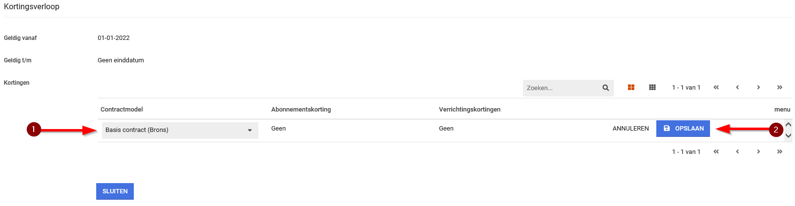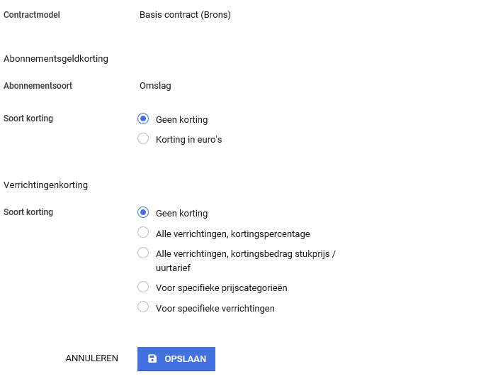 Nu moet je het contractmodel selecteren waarvoor je kortingen wilt instellen. Klik hierna op ‘Opslaan’.