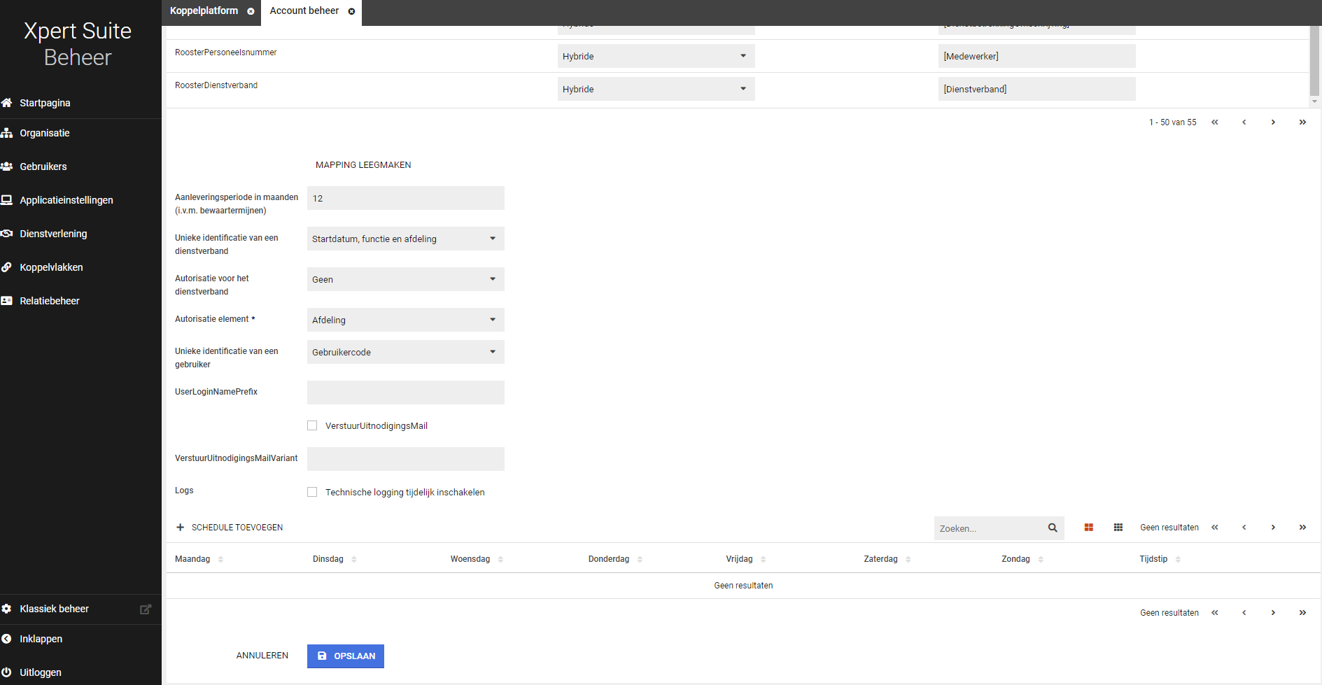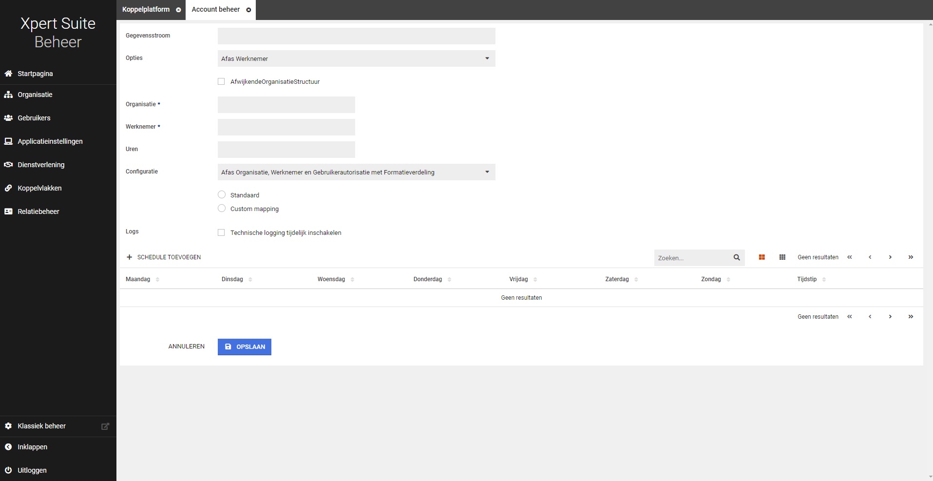 Hierbij kan je aangeven hoe vaak en wanneer de koppeling actuele gegevens mag ophalen uit AFAS. Wanneer je ‘iedere dag’ aan vinkt, draait hij iedere dag op het tijdstip dat je hier instelt. Kies je voor ‘Specifieke dag(en)’, dan kan je zelf de dagen aanvinken dat de koppeling mag lopen. Je kunt de koppeling ook meerdere keren per dag laten draaien. In dit geval voeg je meerdere schedules toe.