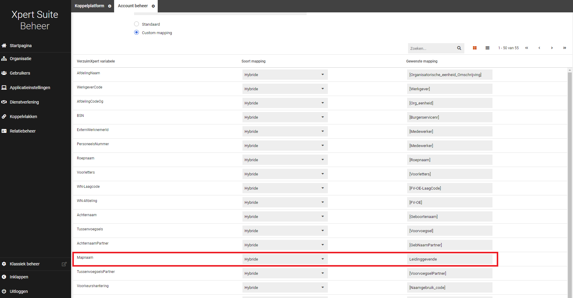 Het is ook mogelijk om de Inlognaam vast te leggen via custom mapping. Zodra deze ingesteld is bij het veld Inlognaam, is deze optie leidend.