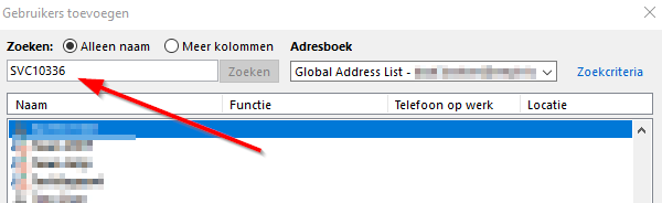 7. Je ziet nu de interne adreslijst van Outlook. Vul nu bovenin de zoekbalk “SVC10336” in. Deze gebruiker wordt nu als zoekresultaat getoond. Kies deze gebruiker en klik onderaan het scherm op “Toevoegen”. Klik hierna op “OK”.