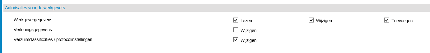 - Gebruiker moet geautoriseerd zijn voor het wijzigen van werkgever verloningsgegevens. Er is geen aparte autorisatie voor het inzien van werkgever verloningsgegevens, je mag als gebruiker de werkgever verloningsgegevens ook inzien als je geautoriseerd bent voor het inzien of wijzigen van werknemer verloningsgegevens. De reden hiervoor is dat je bij het invoeren of beoordelen van werknemer verloningsgegevens ook de werkgever verloningsgegevens nodig hebt.