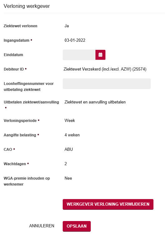 De gebruiker kan vervolgens het 'Klantbeeld' van een werkgever inzien en via de widget 'Werkgever verloningsgegevens' de verloningsgegevens vullen of het subloonheffingennummer wijzigen (overige verloningsgegevens van een werkgever zijn niet wijzigbaar na opslaan).