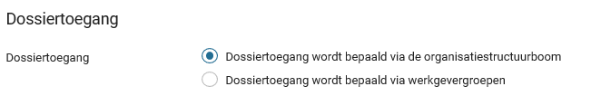 Hier kun je instellen of je de dossiertoegang voor de gebruiker of gebruikersgroep wil laten bepalen via de organisatiestructuurboom of via werkgevergroepen.