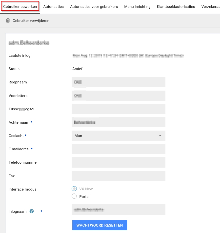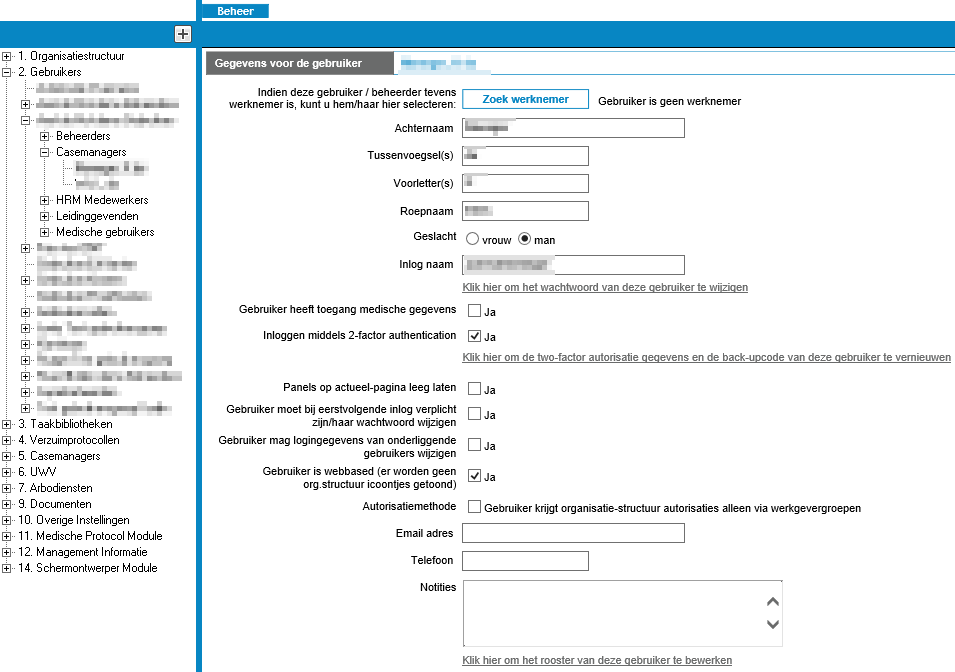 Hier kun je de interface modus aanpassen, een geldigheidsperiode voor het account instellen, de gebruiker autoriseren voor medische gegevens en de mogelijkheid tot 2-factor authenticatie aanpassen.