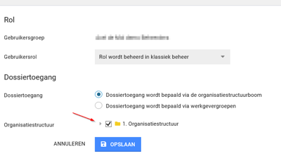 - Vervolgens wordt aangeraden om vanuit de gebruikersgroep/rol in het Klassiek Beheer de autorisaties te erven ZONDER autorisaties voor organisatiestructuur/gebruikers over te nemen wanneer de gebruikersautorisaties afwijken van de groep.