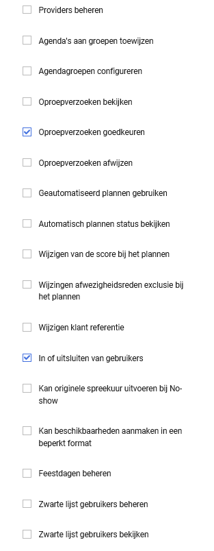 Wat de gebruiker kan doen met de agenda’s (aanmaken van beschikbaarheid, plannen van afspraken via de wizard en meer) kun je instellen in het Klassiek Beheer, zie verderop in deze instructie.