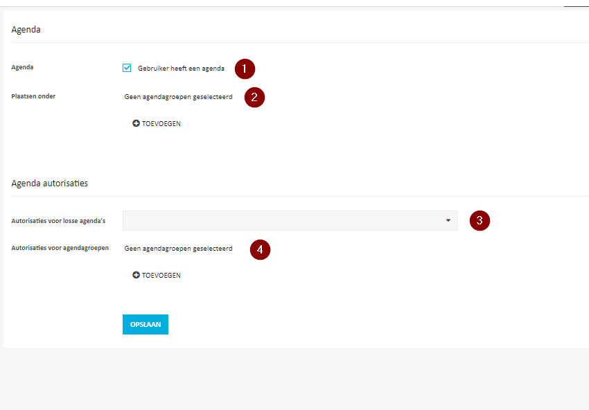 - Bij punt 1 kun je aangeven of deze gebruiker een eigen agenda heeft of niet.