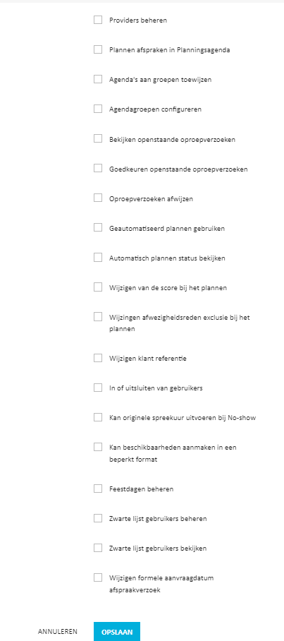 - Bij punt 3 kun je gebruikers toegang geven tot inzicht in de agenda van gebruikers die een eigen agenda hebben. Hiervoor hoeft de gebruiker dus zelf niet een eigen agenda te hebben. Dit wordt vaak gebruikt voor gebruikers die plannen in de XpertSuite. Bij dit punt kun je toegang geven tot losse agenda’s.