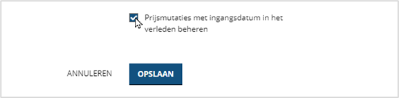 Om met terugwerkende kracht prijsmutaties te mogen uitvoeren dient een beheerder expliciet geautoriseerd te worden middels een nieuwe gebruikerautorisatie genaamd ‘Prijsmutaties met ingangsdatum in het verleden beheren’ (Dienstverlening > Gebruikersbeheer > ‘Gebruiker’ > Interventies)