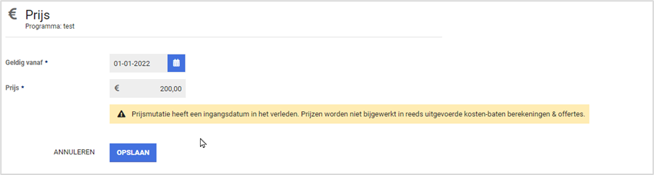 Als in het beheer een prijsmutatie met terugwerkende kracht wordt geregistreerd, geldt deze nieuwe prijs bij het uitvoeren van een Kosten-baten berekeningstaak. Reeds uitgevoerde Kosten-batenberekeningen en offertes worden niet met terugwerkende kracht aangepast.