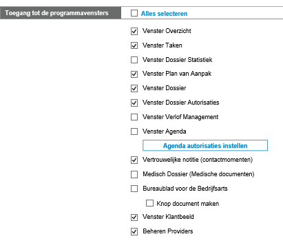 - Tab Trajectendossier - Indien de gebruiker de tab Trajectendossier mag zien, vink je de autorisatie Venster Dossier aan;