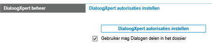 - Tab Berichten - Indien de gebruiker de tab Berichten mag zien, vink je de autorisatie Gebruiker mag Dialogen delen in het dossier aan en stel je de aanvullende autorisaties voor de DialoogXpert in via de knop DialoogXpert autorisaties instellen.