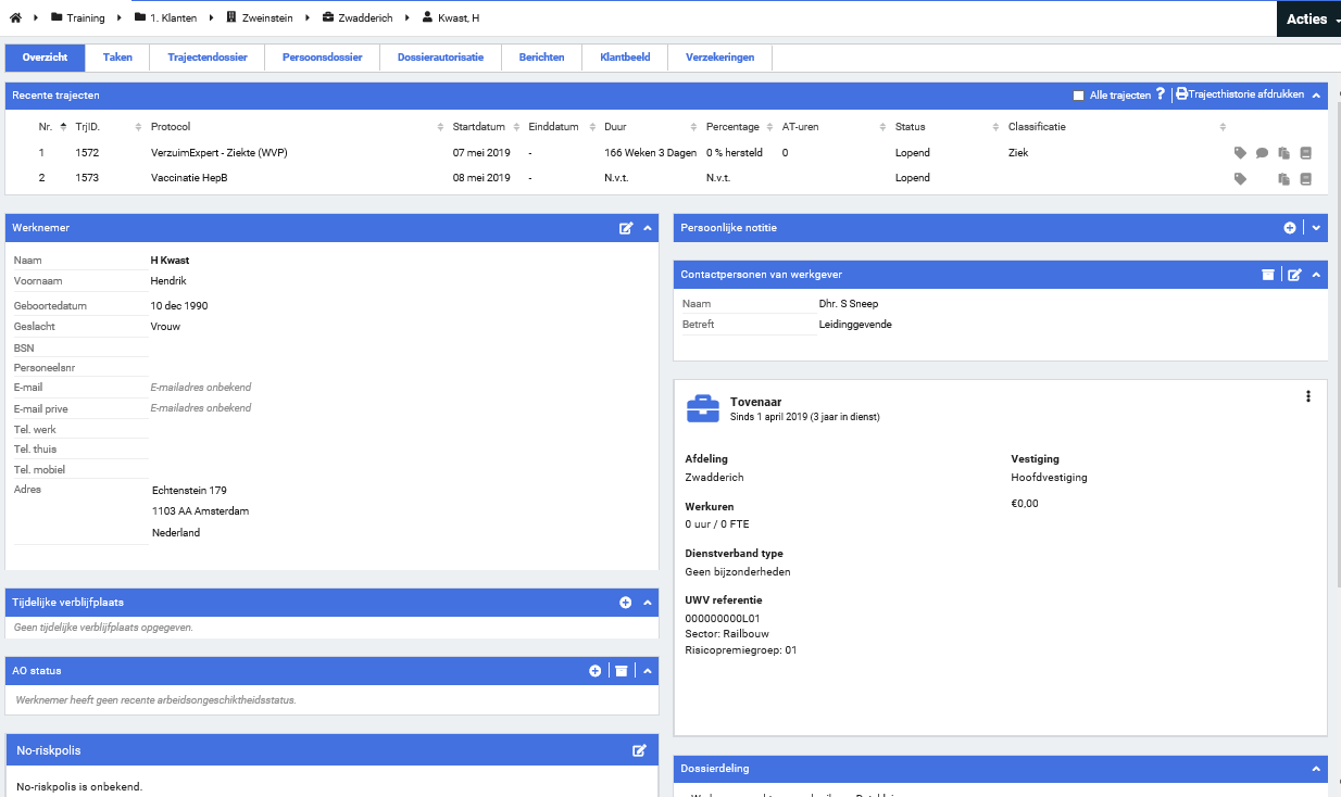 Op deze tab is meer informatie over de werkgever, contactpersonen, klantafspraken en verzekeringen.