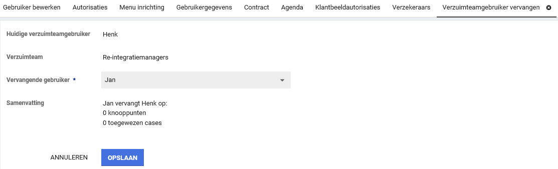 Vul vervolgens de vervangende gebruiker in. Bij Samenvatting is te zien hoeveel knooppunten (organisatieonderdelen) en toegewezen cases overgenomen worden.