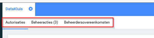In het venster Datakluis kan gekozen worden voor de tabbladen Autorisaties; Beheeracties en Beheerdersovereenkomsten. Vanuit deze tabbladen kunnen de desbetreffende beheerfuncties uitgevoerd worden.