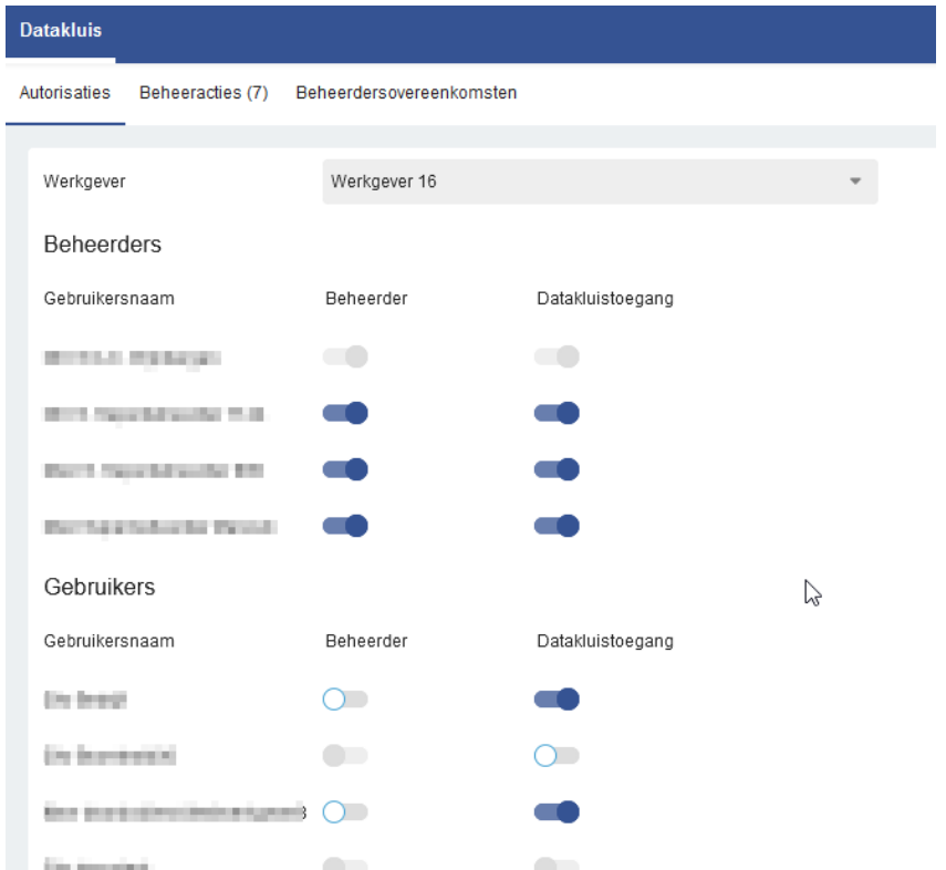 Het tabblad Autorisaties toont de naam van de Beheerders en Gebruikers per werkgever.