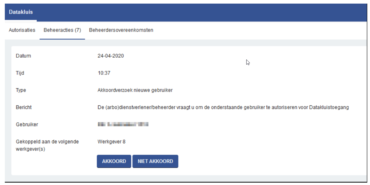 Op het tabblad Beheeracties kan Datakluistoegang Akkoord of Niet akkoord worden bevonden.