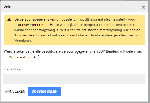 De dienstverlener kan normaal gesproken een dossier niet zien, tenzij met de klant wordt overeengekomen dat zij anoniem mogen zoeken.