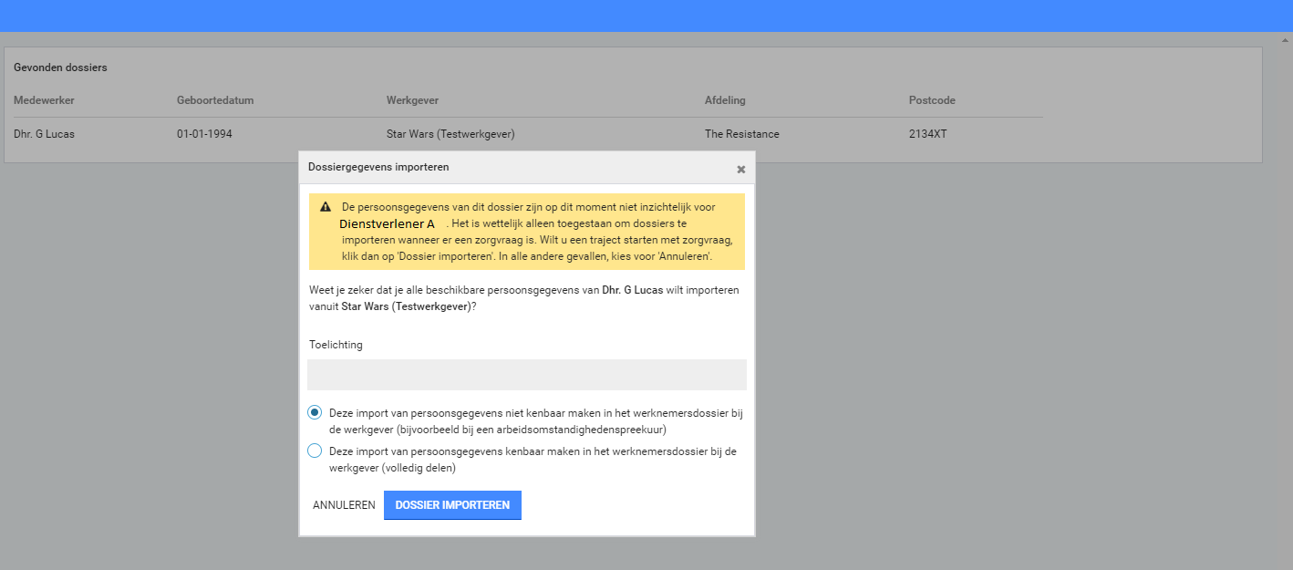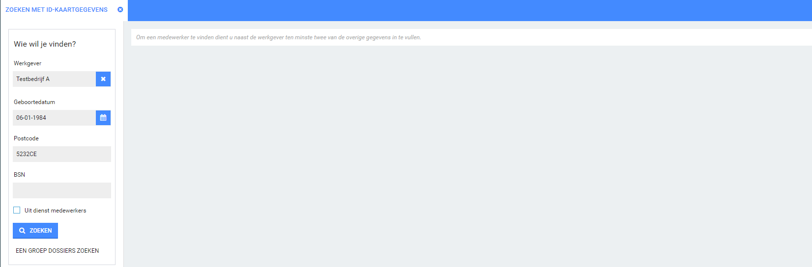 Als het dossier nog niet is gedeeld kun je door het ingeven van bepaalde zoekcriteria de medewerker toch vinden.