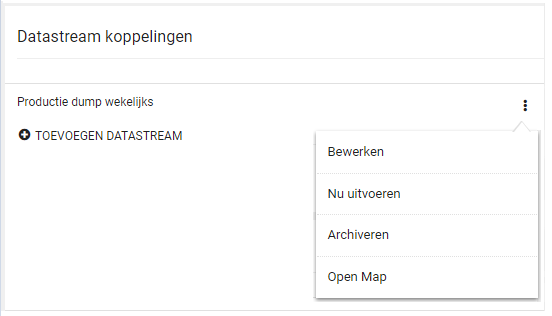 Om een configuratie te verwijderen kan de optie archiveren gekozen worden. Kies hier bijvoorbeeld voor als je de proefdump hebt ontvangen, en de structurele aanlevering van de datastreams via een andere configuratie wordt uitgevoerd.
