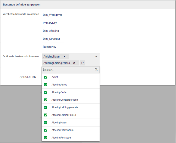 Per bestandsdefinitie kun je vervolgens kiezen welke kolommen je wel en niet wil ontvangen.