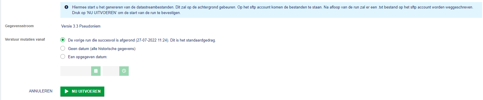 2. Verstuur mutaties vanaf ‘geen datum’. Hierbij wordt alle data gestuurd onafhankelijk van eerder gelopen runs.