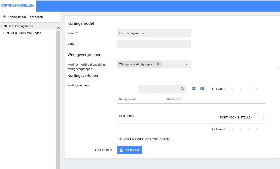 Het is mogelijk om kortingsmodellen in te stellen die bij werkgevers gekoppeld kunnen worden (naast het gewenste contract zelf), waardoor je eenvoudiger (en met minder contractmodellen) toch veel flexibiliteit hebt in de prijsafspraken met klanten. Hierbij geldt dan echter wel dat je bij elke werkgever eraan moet denken dat deze de juiste kortingsmodellen en contractmodellen krijgt. Zie voor meer informatie over kortingsmodellen het artikel: Kortingsmodellen