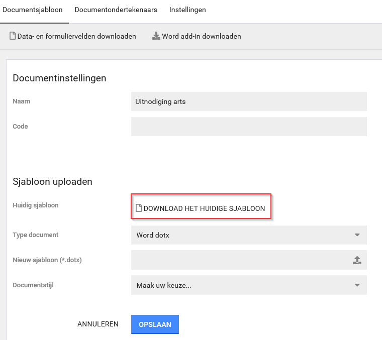Een Word dotx document kun je inzien/bewerken door te klikken op Download het huidige sjabloon. Lees voor een volledige beschrijv hoe het document aangepast kan worden de instructie Documentsjablonen.