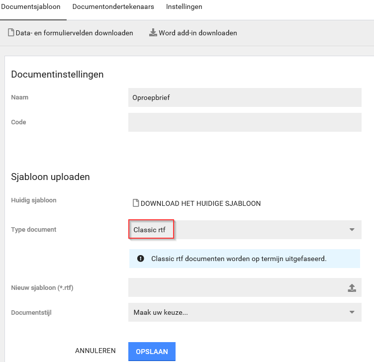 In het rechter scherm zie je de instellingen van het documentsjabloon. Bij Type document staat Classic.rtf of Word dotx. Wij raden aan zoveel mogelijk te werken met Word dotx bestanden; de Classic.rtf bestanden worden uitgefaseerd en de Word dotx documenten zijn veel makkelijker qua opmaak. Meer informatie over Word dotx bestanden vs Classic rtf bestanden kun je hier vinden.