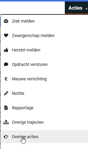 Wanneer je in een werknemersdossier zit, kies je voor Acties -> Overige Acties. Dit is de actielink OverigeActies, die eventueel is toe te voegen indien die nog niet beschikbaar is (zie de aparte instructie bij Portals).