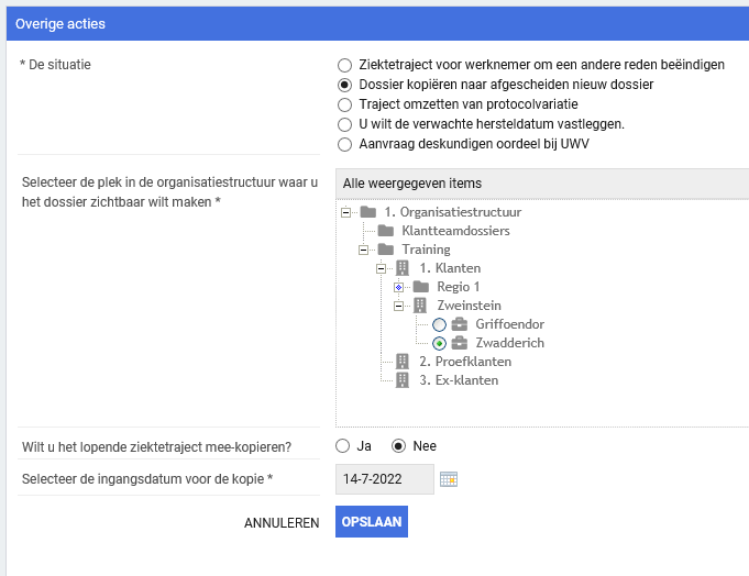LET OP: In Xpert Suite telt de kopie als aparte werknemer en ziekmelding, dus kies de plek waar je dit dossier plaatst zodanig dat het geen ongewenste effecten op de verzuimcijfers heeft. Het beste is om een afdeling te maken die buiten de werkgever-structuur valt.