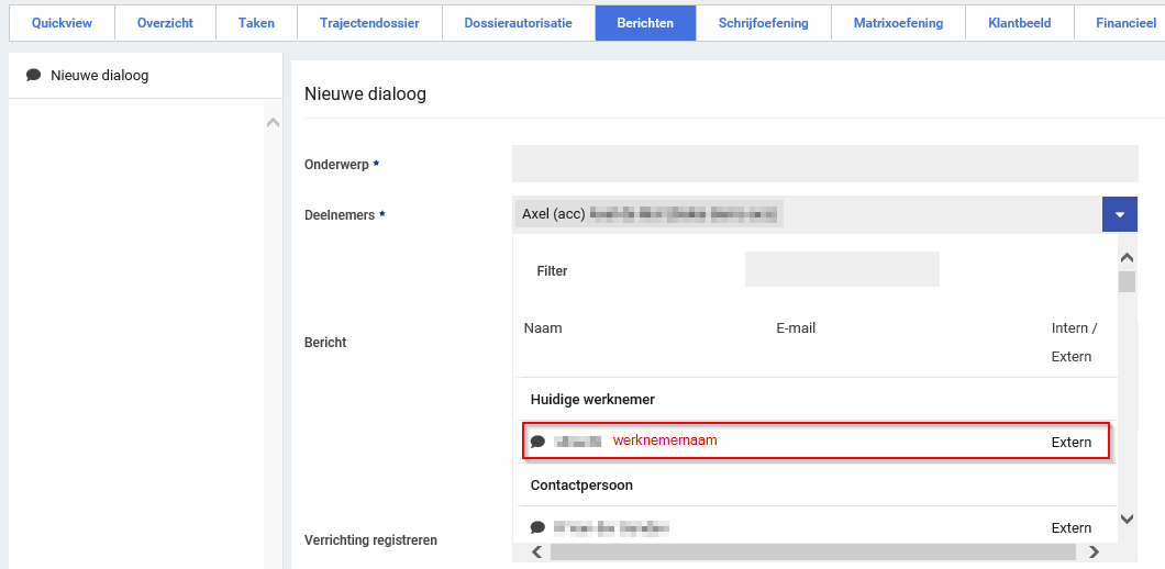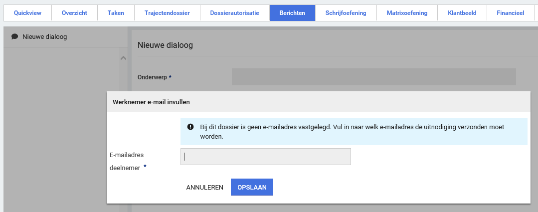 Dit komt omdat, toen er voor de eerste keer op het medewerkersdossier een dialoog gestart is, er nog geen emailadres beschikbaar was bij de werknemer in zijn dossier. Het emailadres wat geregistreerd staat in het tabblad overzicht. De gebruiker heeft toen per ongeluk wel de knop huidige medewerker aangeklikt.