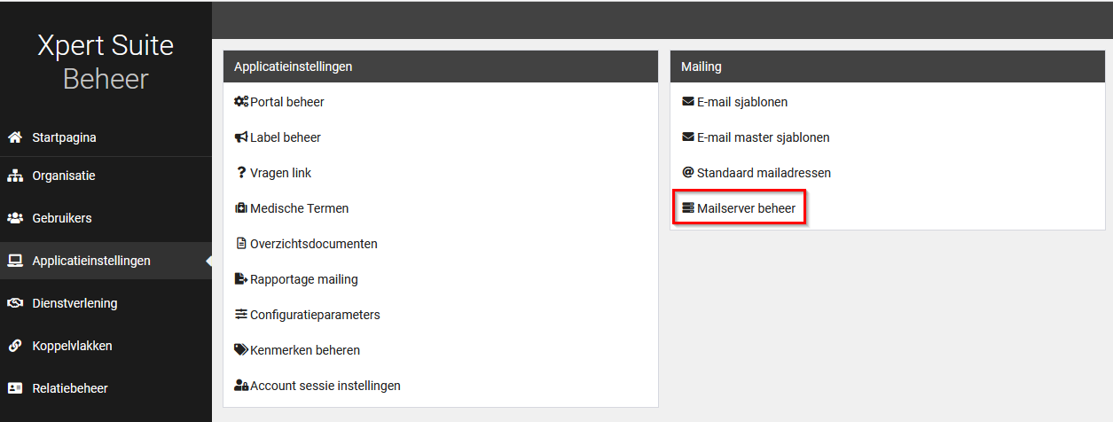 Navigeer naar Beheer > Applicatieinstellingen > Mailserver beheer. Hier heb je de autorisatie ‘Mailservers bekijken’ en ‘Mailservers wijzigen’ voor nodig, te vinden onder Autorisaties > Beheer feature autorisaties voor Emails.