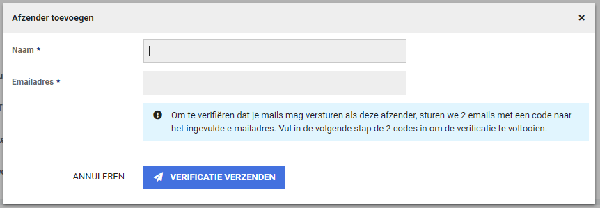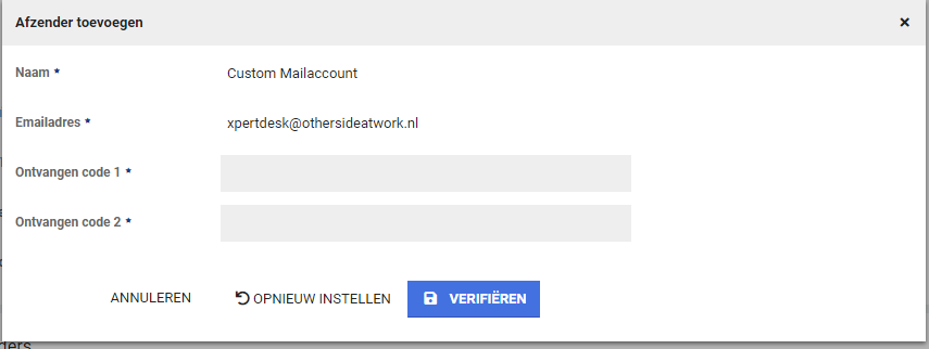 Na het versturen van de verificatie e-mails wordt de mogelijkheid gegeven om beide codes in te voeren, na het invoeren van de beide codes wordt de afzender toegevoegd als beschikbare afzender. Het maakt niet uit welke code als code 1 of als code 2 wordt opgevoerd, zolang ze beide maar ingevuld worden.