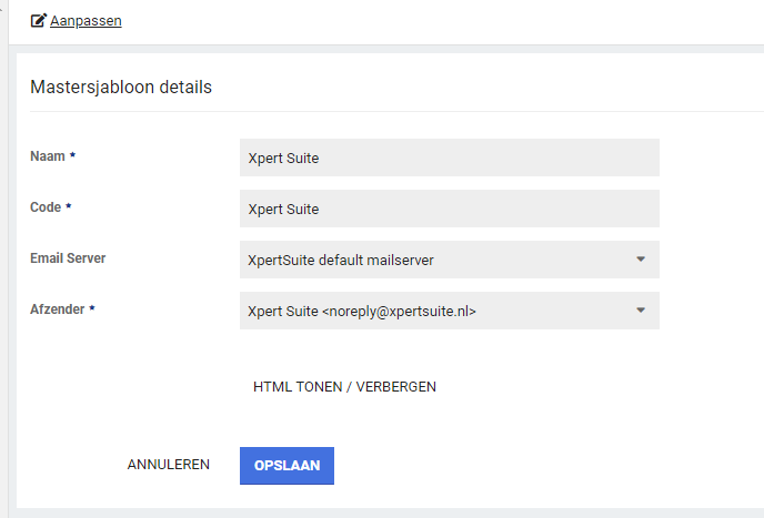 Door bij ‘Email Server’ de gewenste server te selecteren, zijn bij de afzender vervolgens de bij die server behorende afzenders te selecteren. Na het opslaan van de wijzigingen, zullen alle nieuwe e-mails met het betreffende mastersjabloon via de eigen mailserver verstuurd worden.