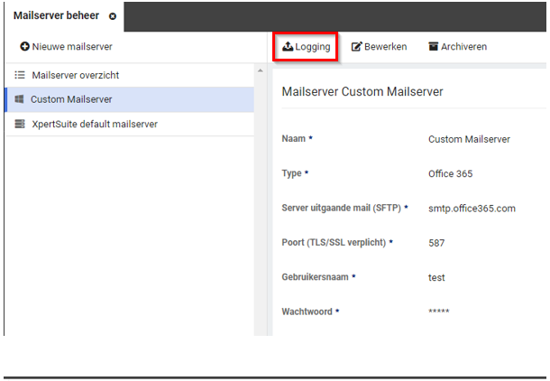 Voor foutanalyse is logging inzichtelijk met betrekking tot het aanbieden van de e-mails vanuit de Xpert Suite aan jouw mailserver, deze toont echter een beperkte historie van enkele weken. Selecteer hiervoor in het beheer wederom de optie “Mailserver beheer” en vervolgens de gewenste mailserver. De knop “Logging” geeft inzicht in de recente e-mails voor deze server met hierbij de status van de verzending: