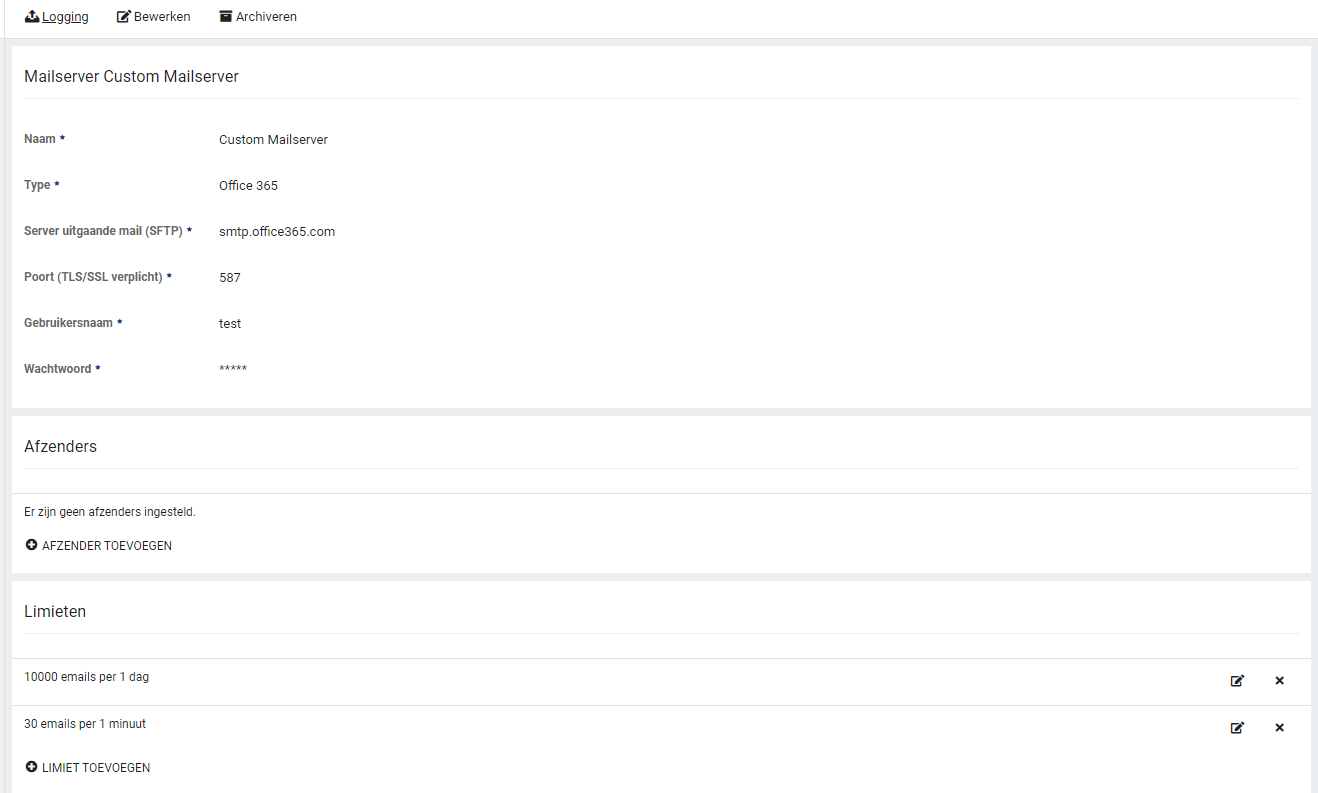 - Eén e-mail via de bijbehorende mailserver om de configuratie te testen.