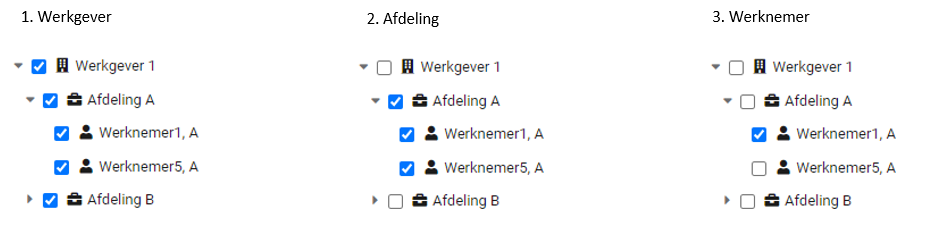 Het autoriseren van een gebruiker voor een werkgever is niet hetzelfde als het autoriseren van een gebruiker voor alle afdelingen van dezelfde werkgever. Hetzelfde geldt voor het autoriseren voor een afdeling, dat is niet hetzelfde als het autoriseren voor alle werknemers van een afdeling.