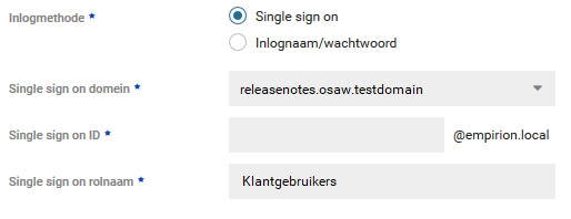 In het scherm bij Stap 5 dient de inlogmethode Single sign on geselecteerd te worden. Daarna kan de beheerder het domein, het ID en de rolnaam instellen.