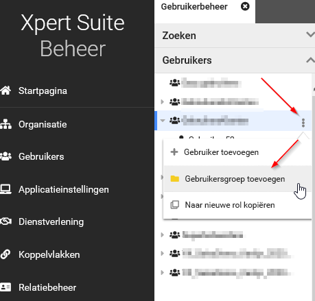 Klik in het tabblad Gebruikers op de drie puntjes van een bestaande gebruikersgroep en selecteer Gebruikersgroep toevoegen.
