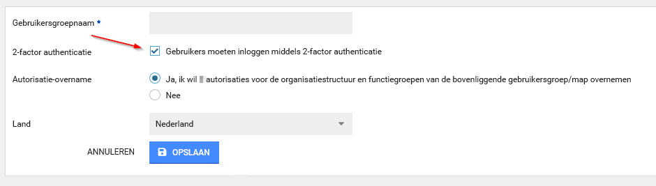 - 2-factor authenticatie : Indien aangevinkt moeten nieuwe gebruikers onder deze groep automatisch inloggen middels 2-factor authenticatie. Otherside at Work raadt aan deze optie altijd in te schakelen ter bescherming van de gegevens in XS.