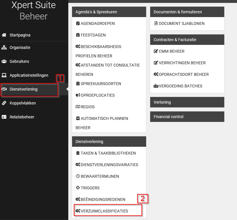 2. klik vervolgens op "dienstverlening" en daarna op "verzuimclassificaties"