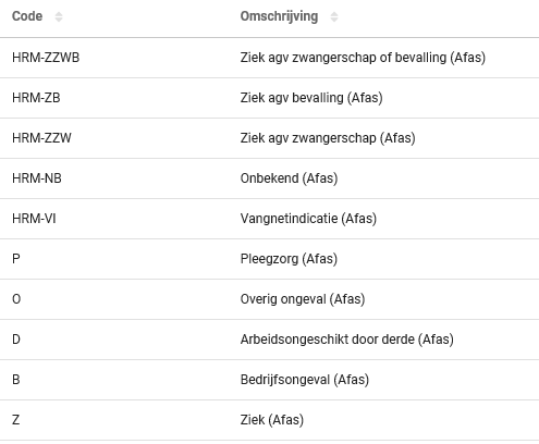 Lijst met verzuimcodes en omschrijving van verzuimclassificatie vanuit AFAS (LET OP: Deze gegevens moeten 1 op 1 overeenkomen met de tabel)