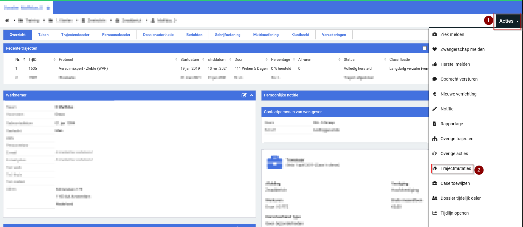 Stap 1. Open op het dossier het Acties menu en kies voor Trajectmutaties